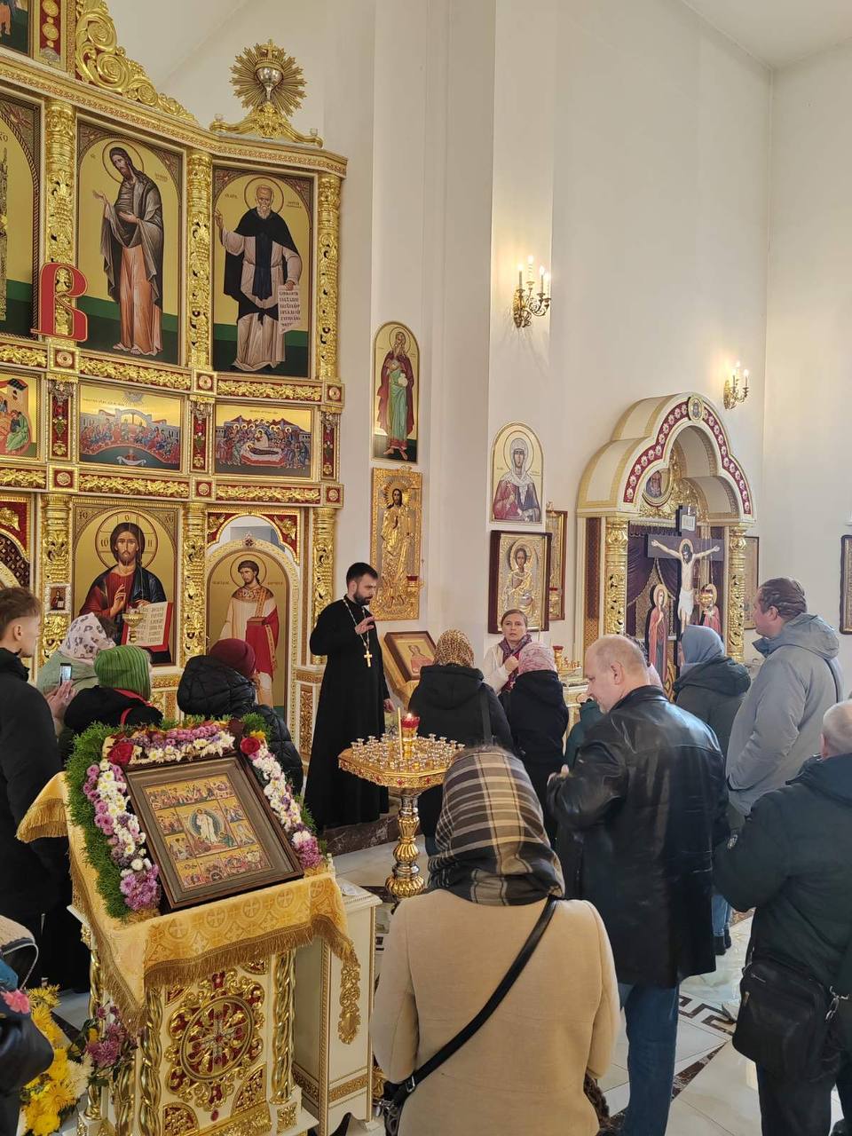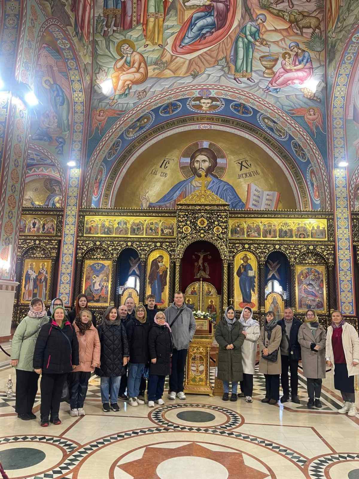 Затем группа проследовала в кафедральный собор Рождества Христова. Паломникам рассказали об истории собора, о символической связи с главным предприятием города ОАО "Беларуськалий". Гости поклонились особо чтимым иконам, увидели фрески и мозаики собора. Большое внимание в ходе экскурсии было уделено святой Софии Слуцкой, так как поездка была направлена на более глубокое знакомство с местами, связанными с жизнью святой. Затем осмотрели криптовый храм во имя пророка Иоанна Предтечи и первый храм соборного комплекса - храм в честь Рождества Пресвятой Богородицы. Стоит отметить, что это первый храм города Солигорска, возведенный в 2000 году, в этом году он праздновал свое 25-летие со дня освящения.